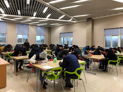 4:00考试正式开始,食堂内里一片寂静,只听见“刷刷”的书写声,同事们个个信心十足,沉着冷静,积极思考,埋头答题。