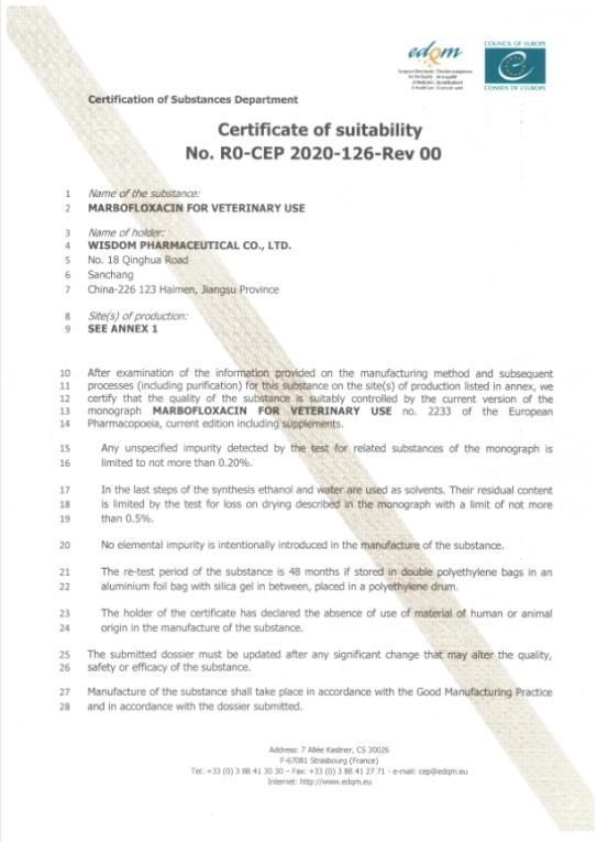 2021年9月21日,江苏慧聚药业有限公司通过EDQM的技术审批,获马波沙星CEP证书。